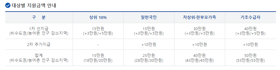구분 지급 시기 지급 대상 기본 금액 추가 지급 1차 지급 2025.7.21~9.12 전 국민 일반: 15만 원 차상위층: 30만 원 기초수급자: 40만 원 비수도권: +3만 원 농어촌 감소지역: +5만 원 2차 지급 2025.9.22~10.31 상위 10% 제외한 국민 90% 10만 원 없음